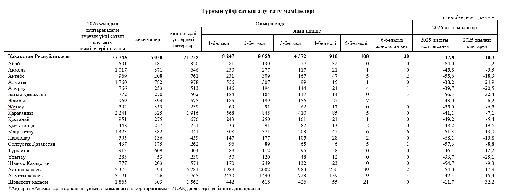 2026 жылғы қаңтарда тұрғын үйді алып-сату мәмілелері алдыңғы жылдың тиісті айымен салыстырғанда 10,3% азайған, ол кезде 30 917 мәміле ресімделген болатын. Жылдық мәнде мәмілелер санының ең жоғарғы өсімі Шымкент қаласында (+32,2%) байқалды, ең қатты төмендеу – Батыс Қазақстан облысында (-32,4%)..png)